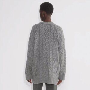 This is a fully fashioned crewneck sweater with dropped shoulders for an oversized fit. It's knit with 100% extra-fine merino wool with a soft, warm feel. It's constructed with a Cable stitch in a unique, custom design for a three-dimensional look and texture.