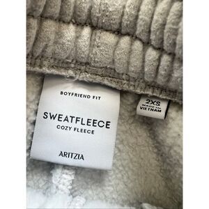 Boyfriend fit SweatFleece cozy fleece shorts from Aritzia. Elastic waistband with drawstring and waist pockets. Aritzia embroidered just under left pocket.