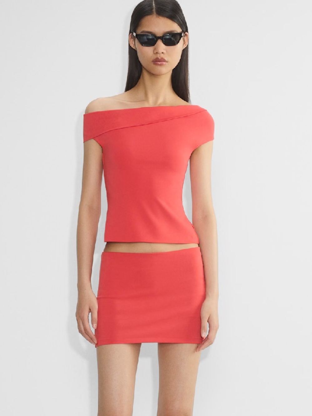 Matching off-shoulder crop top and fitted mini skirt. Clean lines with a subtle neckline twist. Sleek, body-skimming silhouette. Perfect for a bold, modern look.