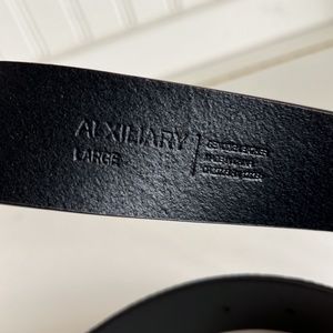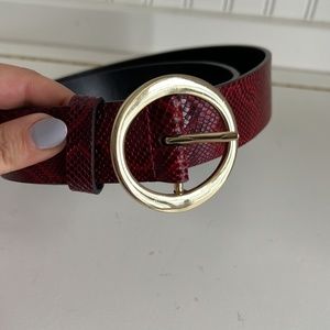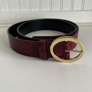 Stylish red and black belt. Features a gold oval buckle. Perfect for any outfit.