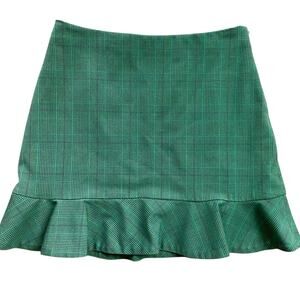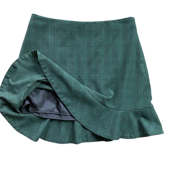 Aritzia Sunday Best Astala Mini Skirt in a green and black plaid pattern, high-waisted with a ruffled hem