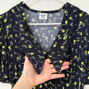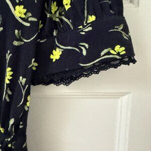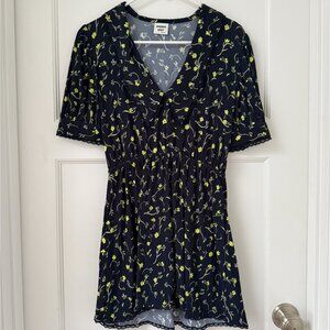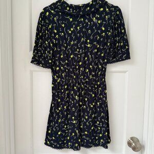 Dark navy blue mini dress with neon yellow-green flowers. Features a feminine bib colar and lace details on the hem, collar and sleeves. Cinched at the waist with an elastic.