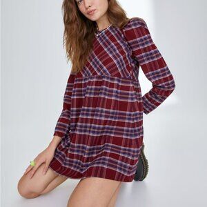 This is a crew-neck babydoll dress with inseam pockets, puff sleeves and a keyhole cutout at the back. It’s made from cozy flannel twill made with recycled materials and LENZING™ ECOVERO™ Viscose — wood-based fibres sourced from responsibly managed forests and produced through an environmentally low-impact process.