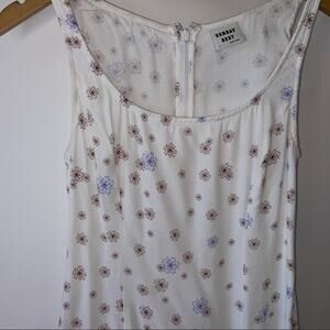 This is a sleeveless, square-neck shift dress with princess seams and a thigh slit. It's made with fluid, flowy fabric. This version comes in a floral print that was designed in-house.