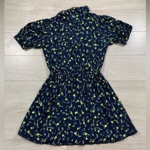 This is a V-neck mini dress with a pointed collar, cinched elastic waist and puff sleeves. It's made from flowy, textured fabric. This version comes in a hand-painted floral print that's exclusive to the brand.