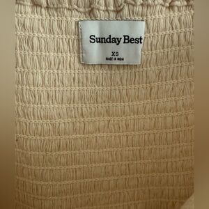 This cream mini skirt by Sunday Best features a playful bubble style with ruffled, tiered layers that add texture and movement. Perfect for casual outings or resort wear, its flouncy silhouette offers a chic and versatile look.