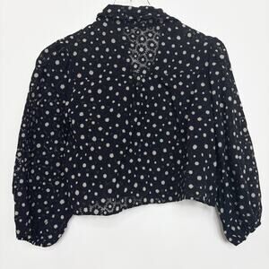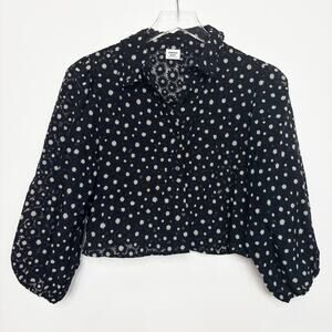 This is a cropped, button-front blouse with puff sleeves and a pointed collar. It's made from lightweight fabric with a semi-transparent floral pattern woven into it.