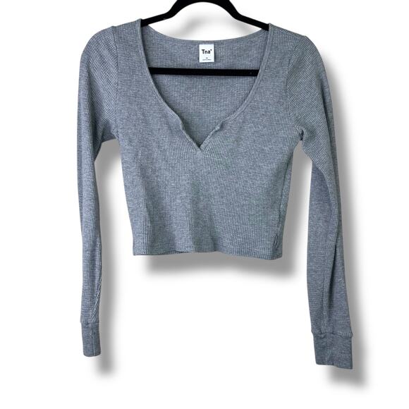 Aritzia TNA Gray V-Neck HomeStretch Rib Henley Thermal Knit Long Sleeve Crop Top. Waffle knit fabric that is soft with a lot of stretch.