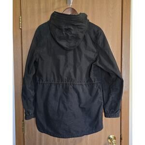 Aritzia TNA Military Edition Utility Drawstring Waist Jacket In The Color Black, size medium. In good prelove condition. It has minor discoloration throughout that seems to go with the utility look so it looks intentional. Please review pics. **Also, hood faux fur trim NOT included.** Thick, sturdy jacket w/ adjustable drawcord waist.