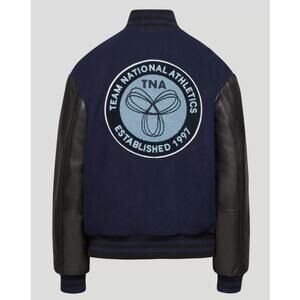 Aritzia TNA Total Eclipse Blue Prince Varsity Bomber Leather Sleeve Jacket