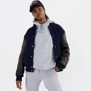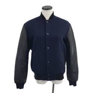 Casual. Coveted. Classic. This is a relaxed bomber jacket with dropped shoulders, ribbed trim, and genuine leather details. The body and sleeves are insulated with vegan fill for lightweight warmth without the bulk. It's made with a warm, felted wool blend that's dense and textural. This version comes in a varsity style chenille patch graphic on the back, that's exclusive to the brand. Fully lined. Ribbed collar, cuffs and hem. Welt pockets with genuine leather trim. Interior welt pocket with genuine leather trim. Snap closures. Content: 70% wool, 30% nylon. Sleeves: 100% genuine leather. Body lining: 100% cotton. Fill: 100% polyester. Sleeve lining: 100% polyester. Rib trim: 98% acrylic, 2% elastane. Professional leather clean only. In preowned condition.