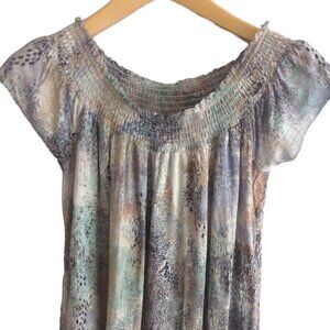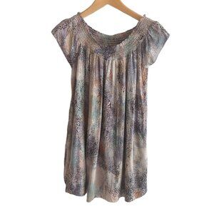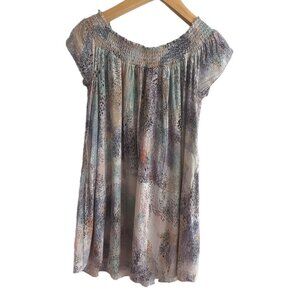 This is a trapeze dress with a smocked, off-the-shoulder neckline by Aritzia's Talula brand. It's made with lightweight, crinkled twill in a multicoloured pastel print. This dress style has been reintroduced by Aritzia this season under their Sunday Best line.