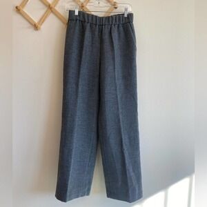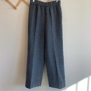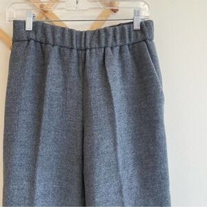 Grey mid-rise, wide-leg pants with an elastic waist. They’re made with heavy woven flannel.