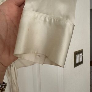 Wilfred by Aritzia satin blouse in ivory/champagne color, size small. Cupro fabric (silk like). Small stain on sleeve cuff and almost impossible to see small stain on front as shown. These could be dry cleaned and removed. Drapes beautifully with its relaxed fit, gorgeous details, fine buttons and the perfect cuffed sleeves. Includes extra buttons attached to tags.