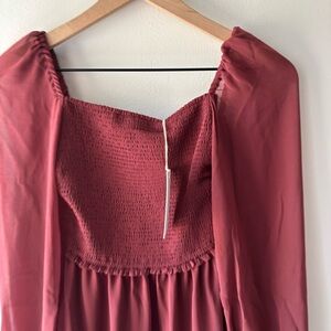 This is a tiered mini dress with a smocked bodice, a square neckline and voluminous sleeves. It's made from semi-sheer chiffon with a crepe-like texture."