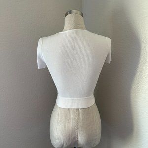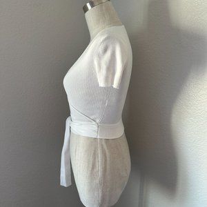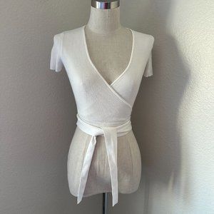 Short sleeve wrap sweater with a tie waist detail. V neckline, rib knit very soft. Excellent used condition.