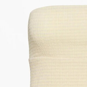 This is a strapless mini dress with an empire waist. It's made from textured Japanese seersucker with a hint of stretch.