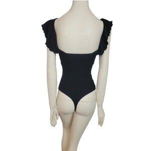 Aritzia Wilfred Black Maeva Bodysuit Ruffled Top Blouse Fine Ribbed Thong cut XS