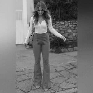 Pants feature an elasticated mid-rise waistband and a flared leg. They are made from a stretchy ribbed Roman-stitch fabric that hugs your figure.