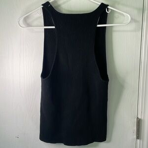This sleek black top from Wilfred offers a fitted silhouette with a buttoned front, perfect for a versatile and stylish look. The sleeveless design and clean finishes make it an ideal choice for layering or wearing on its own.