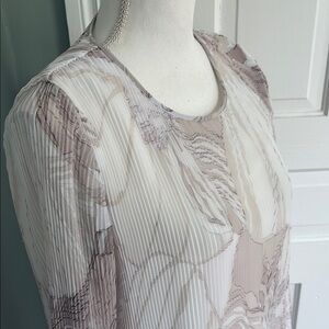 Elegant floral sheer dress with long sleeves. Features a beautiful blend of cream and tan colors.