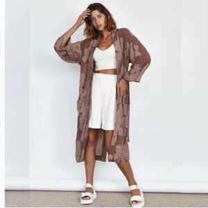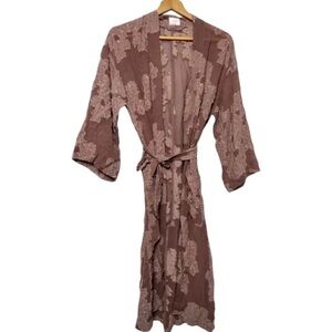 Elegant pink robe jacket by Aritzia Wilfred. Features a subtle floral design. Ideal for layering.