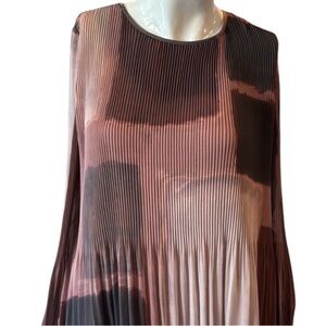 Wilfred Elba pleated plum geo print chiffon mini dress has balloon sleeves with elasticized cuffs and a keyhole button back. The stock photos are the same style in a slightly different print!