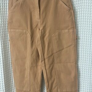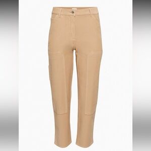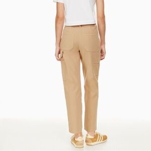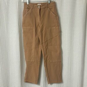 These are high-rise utility pants featuring side patch pockets with a hammer loop, back patch pockets and a knee patch. They’re made with soft-brushed cotton sateen.