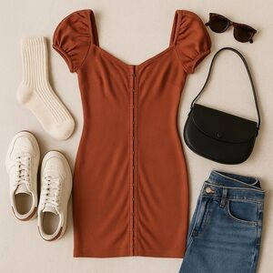 This rust-colored Wilfred Free dress is a fall-ready essential with a flattering shape. Puff sleeves, ribbed stretch fabric, and full hook-and-eye closures down the front create a unique indie vibe. Easy to dress up for date night or down for campus days. Size Small. Soft and comfy, perfect for those chill-but-cute moments.