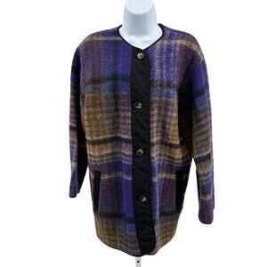 Aritzia Wilfred Free Plaid River Jacket Women's Size XS Brown/Blue/Purple with Plaid/Check Pattern, Boiled Merino Wool Blend, Button Down Closure, Hand pockets, Lined, Oversized, Style# KNB 07-04-39307- Wl22, Casual, Travel, Everyday.