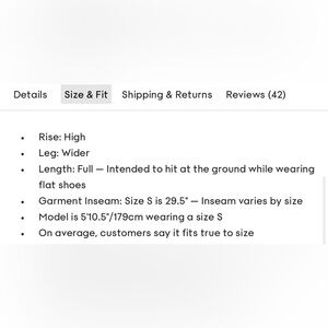 Garment Inseam: Size S is 29.5" — Inseam varies by size