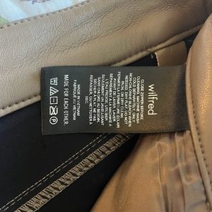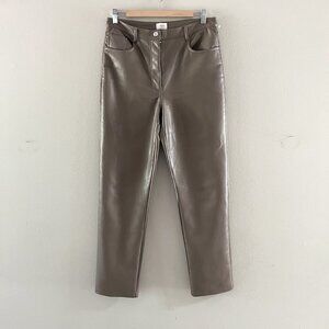 Wilfred Vegan leather pants. These high-waisted pants have five-pocket styling and a slim fit. They're made with premium vegan leather from Japan crafted for superior shape retention, easy care and an authentic leather look. Size 10 with approximate measurements laying flat of 15" waist, 12" rise, and 30" inseam. these pants still have part of the price tag on, but also have some imperfections on the back of one leg (see photos). Price reflects condition. Material: 100 % Polyurethane with 100% Nylon lining. From a smoke-free, dog friendly home.