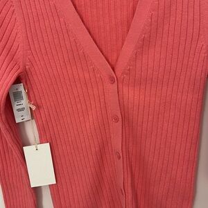 Brand new! Long sleeve sweater with button closures. Can be worn open with the a tank underneath as well! Materials are wool and cotton. Color is a gorgeous pink color.