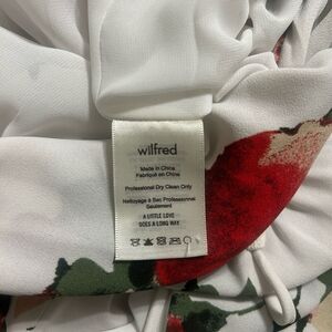 Aritzia Wilfred Sabine Dress in White with Red Green pink flowers. Size Medium. Pockets. Surplice faux wrap front. Sleeveless v neck. Lined. Machine washable polyester. Excellent used condition - no flaws detected. See photos for fabric tag and measurements. Approximate length: 33”; pit to pit: 18.5”; waist laid flat: 18.”