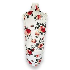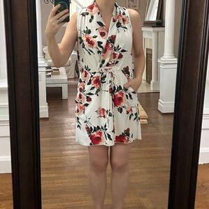 Aritzia Wilfred Sabine Dress in White with Red Green pink flowers. Size Medium. Pockets. Surplice faux wrap front. Sleeveless v neck. Lined. Machine washable polyester. Excellent used condition - no flaws detected. See photos for fabric tag and measurements. Approximate length: 33”; pit to pit: 18.5”; waist laid flat: 18.”