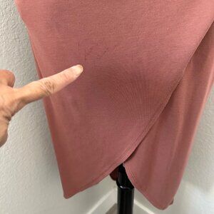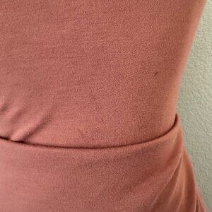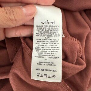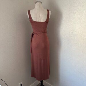 This Aritzia Wilfred Saturn A line midi dress features a double square neckline and a sleek, sleeveless design. Crafted from a viscose blend, it offers a slim fit with a wrap side-tie skirt, making it a versatile piece for any occasion. Two small stains showing on last pico, otherwise good used condition.
