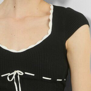 Feminine and fitted, this Wilfred Soloist Sweater is a short sleeve sweetheart knit top with a ribbed texture, scalloped trim, and a dainty white tie just under the bust for a subtly cinched silhouette. The contrast white stitching and neckline detail add a playful, vintage-inspired touch.