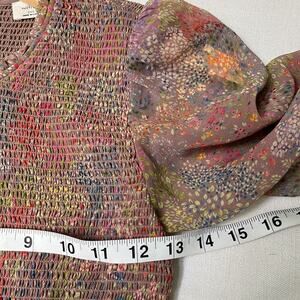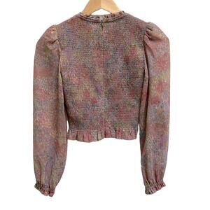 Details: size 2XS, cropped blouse with a smocked bodice, ruffled hem and voluminous princess sleeves. semi-sheer chiffon that has a crepe-like feel, hand-drawn print, Great Preloved Condition
