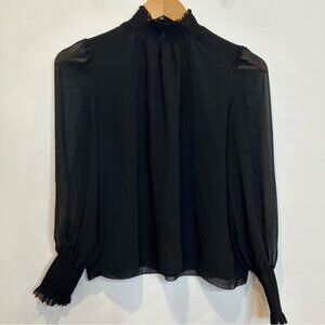 Aritzia Wilfred Valencia Blouse Mock Neck Puff Sleeves Smocking Semi-Sheer Black