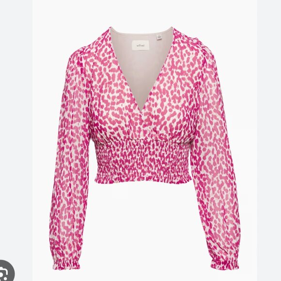 This is a V-neck blouse with long sheer sleeves, a smocked bodice and ruffled edges. It's made with Fête Chiffon — lightweight, semi-sheer fabric with an ethereal drape. This version comes in an exclusive animal print that was designed in-house.