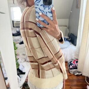 Aritzia babaton Plaid Crew Neck Sweater - Cream and Brown 100% wool Sz S
