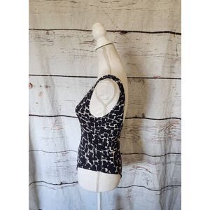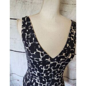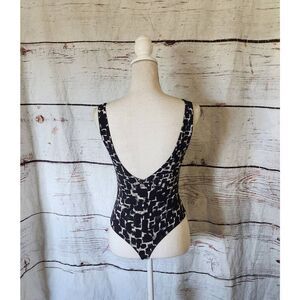 This is a sleeveless bodysuit with a thong-cut bottom and double V neckline. It's made with Babaton's signature Contour — luxe, ultra-flattering fabric coveted for its smoothing effect and second-skin feel. Essential for every body. Black and tan print. In very good condition.