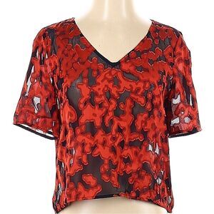 Transform your holiday look with this exquisite Aritzia blouse. Crafted in sheer black fabric featuring a captivating red design, its V-neck design adds a perfect blend of allure and elegance. Embrace festive chic effortlessly with this wardrobe essential.