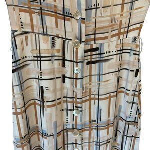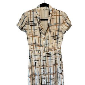 Chic midi dress with an abstract plaid pattern. Features button-up front and short sleeves. Ideal for versatile styling.