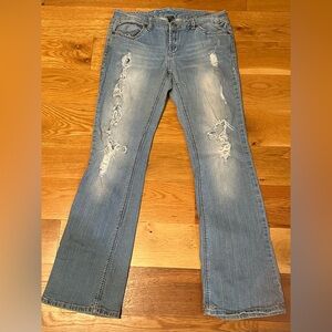 EUC Aryia Distressed Bootcut Denim Jeans Size 11/12. 5 Pocket jeans with Embroider button back pockets.