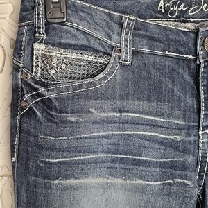 Ariya Jeans, Boot Cut Jeans, Stretch Denim, Medium Wash Jeans, Embellished Pockets, Whiskered Jeans, Size 13/14 Jeans, Junior’s Bootcut, Western Style Jeans, Mid Rise Jeans