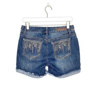 Ariya Jeans raw hem cuffed denim shorts with whiskering and with rhinestone embellishments and embroidery on back pockets