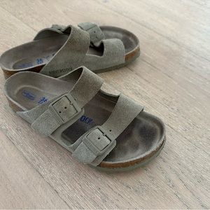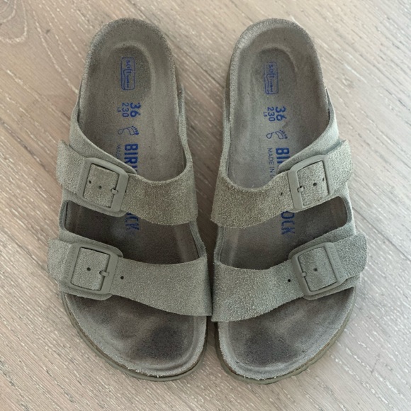 Arizona soft footbed faded khaki.” Regular width. The buckles match the suede for that “fancy Birk” look. Size 36. VGUC.
