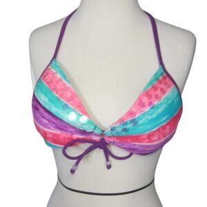 Stay vibrant in this fun and flirty bikini top from Arizona Jean Co. It features a colorblock sequin design with tie-front detail and a halter neckline. Perfect for summer pool days, beach parties, or Y2K-inspired festival looks. Gently pre-loved and ready to shine in a new wardrobe.