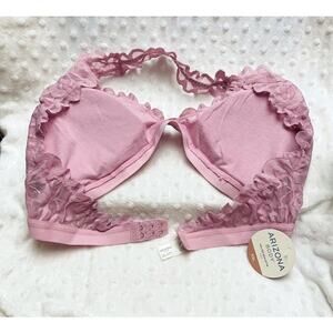 Brand new, with tags, Arizona Body Intimates Coordinating Lace Halter Bralette & Boyshort. Color is mauve mist, a very pretty pink/purple mix. Both bralette & boyshort are XXL, bralette has a 2 hook back closure, single over the neck halter strap, soft elastic at the bottom, & is padded. Boyshort has very soft elastic at waist & soft comfortable lace. Measures; bralette- 15 1/2" side to side when on first hook, hook area i 1" across, halter neck strap from top of padding to top of one side is 8", boyshort is 17" from side to side when laying flat, side of short is 5" top to leg opening. Comes from a smoke free, pet free home.